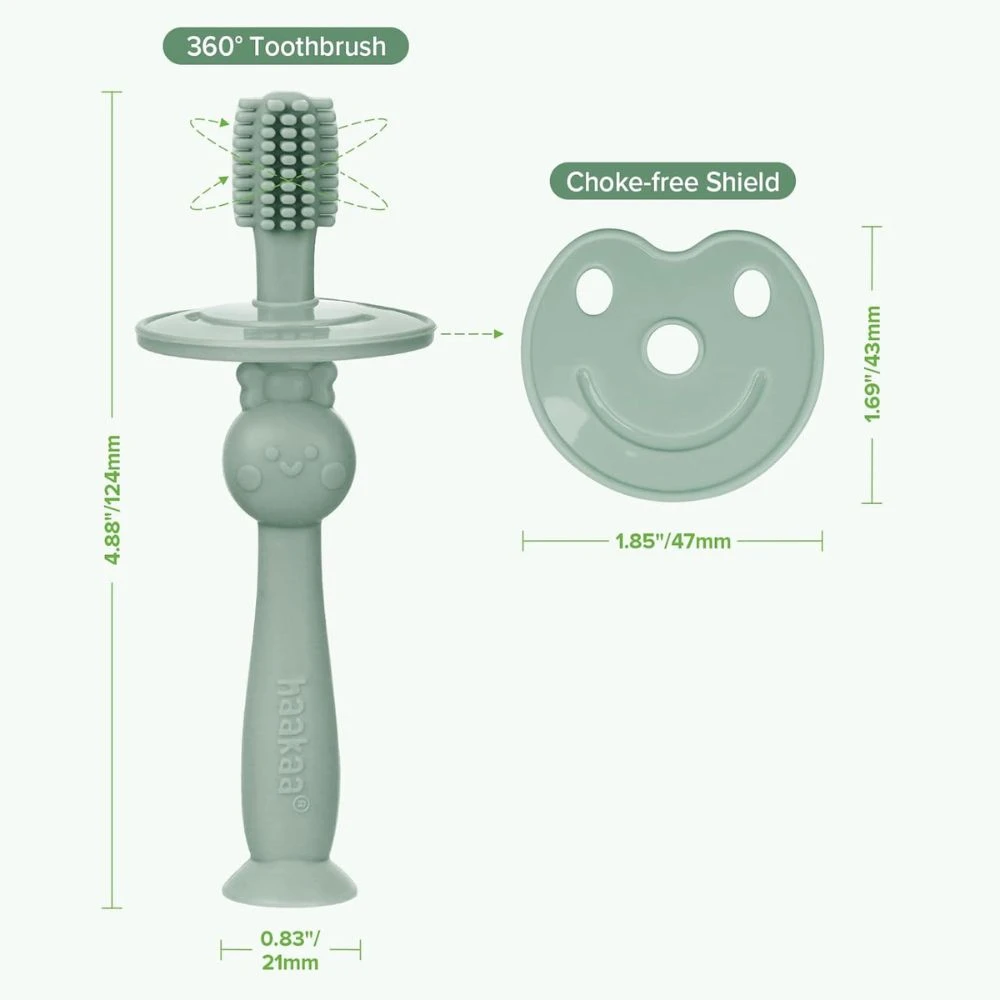 Our 360° Toothbrush is made from soft 100% food-grade silicone and is completely safe for babies, massaging and cleaning their delicate new gums and teeth. It also has a suction base to make it easier to store without it tipping over, preventing it from getting germs and other nasties on the bristles. It’s the perfect brush for starting your child’s dental care and a great way to encourage them to brush and instil good dental hygiene habits from a young age.